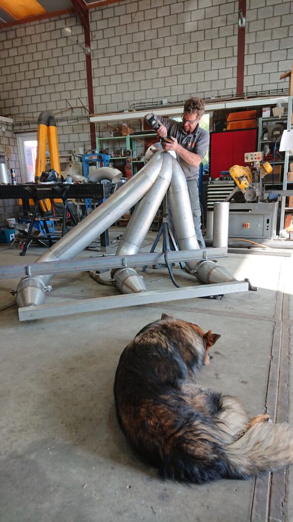 Uitlaatgassen tracé compleet met compensatoren, broekstukken, regenkap of pijp met vogelbeschermgaas.