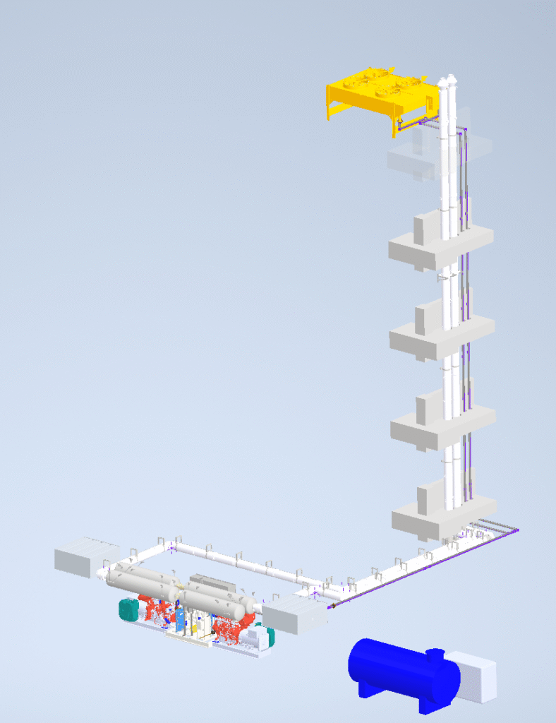 Bij de Korne tekenen we ook gehele projecten uit. de klant levert het kern onderdee, bijvoobeeld een dieselaggregraat, en de Korne tekent op haar beurt de verschillende onderdelen de motor heen. Hieronder vallen bijvoorbeeld het uitlaatgassentraject, koelwater traject, die koeler (op het dak) en uitlaat gassendempers bij de motor.